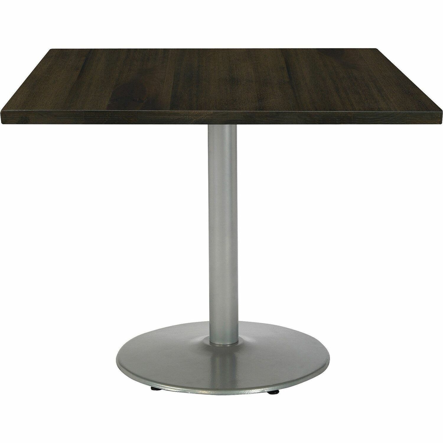 Pedestal Table features a thick, high-pressure laminate top that's durable and wipes down easily for quick cleanings. Square top has an attractive edge that won't crack or peel to maintain a sleek style for years to come. Solid steel, round base has leveling glides to prevent the table from wobbling on uneven floors. Easy-to-build design allows you to quickly put this table together to ensure proper assembly. Cafe height is perfect for sitting positions with your feet on the floor.